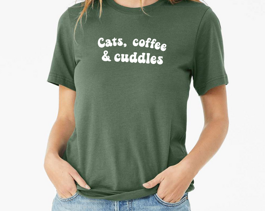 [Clearance 20%] Cats, Coffee & Cuddles Crewneck T-shirt, Pine
