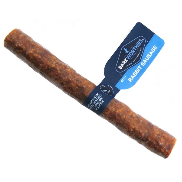 Barkworthies Rabbit Sausage is an all natural, savory treat made from free range, grass fed rabbit with a mouthwatering flavor your dog will love! Product of Argentina. Size: 6" long.