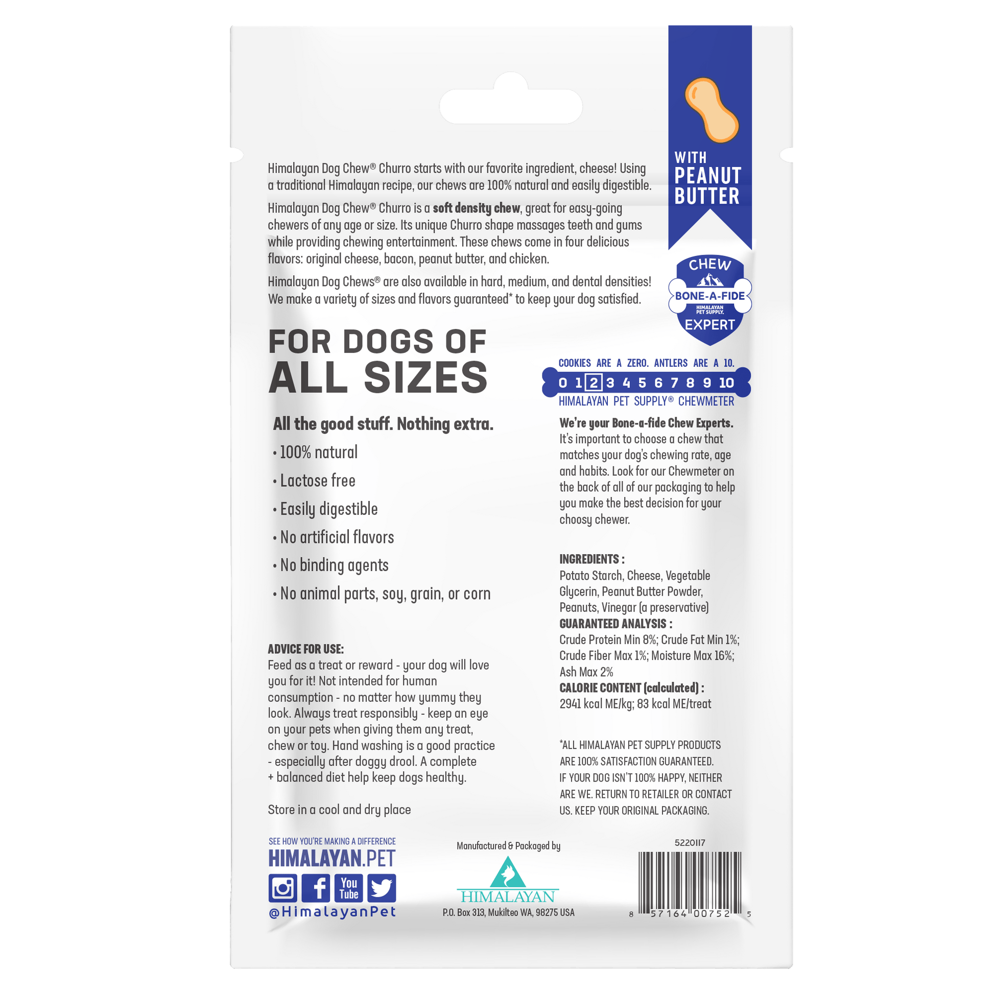 Himalayan Dog Chew CHURRO Peanut Butter is our softest density chew, great for the easy-going chewers and dogs of all ages and sizes. This savory treat is meant to be consumed in a single chew session, providing your dog with the added benefit of oral health. Its unique shape gets between teeth to scrub and scrape, reducing plaque and tartar build-up. Himalayan Dog Chew Churro Peanut Butter is lactose, grain, and gluten-free and is easily digestible.