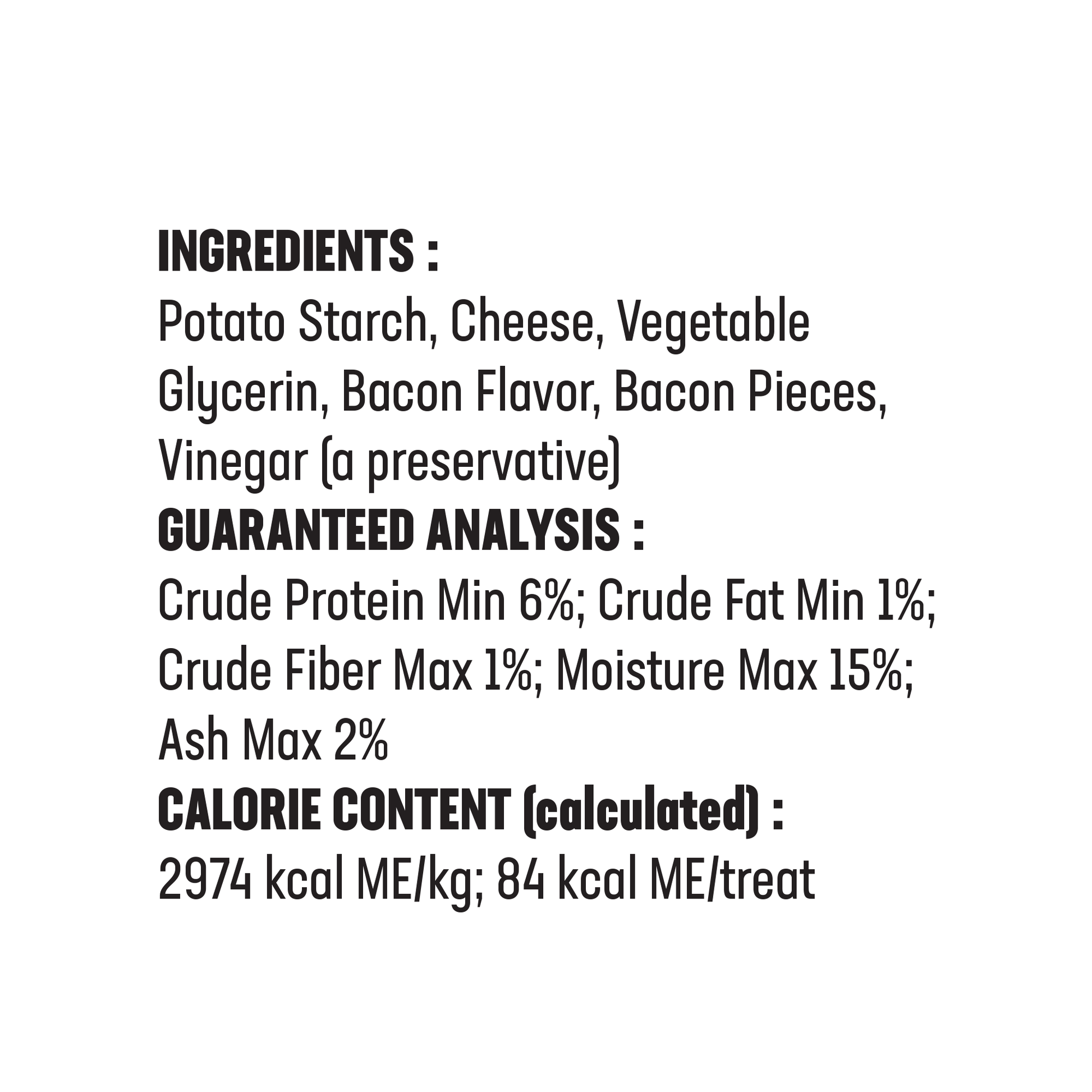 These all-natural chews are available in four savory flavors your dog will truly love; Cheese, Peanut Butter, Chicken, and Bacon.