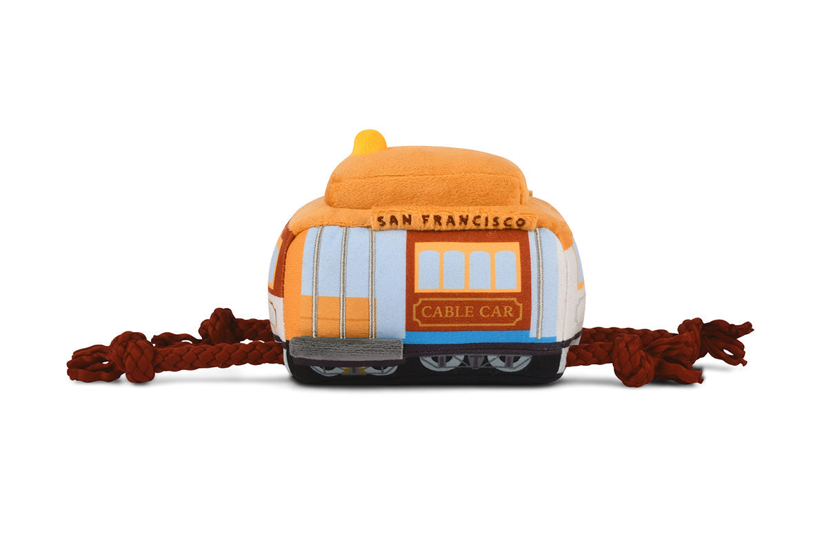- San Pup-cisco Cable Car: Hold on tight and enjoy the views with this classic Cable Car toy. Your furry friend will love the body’s bold squeaker and crinkly roof, while challenging you to a game of tug-of-war with its two sliding rope tracks