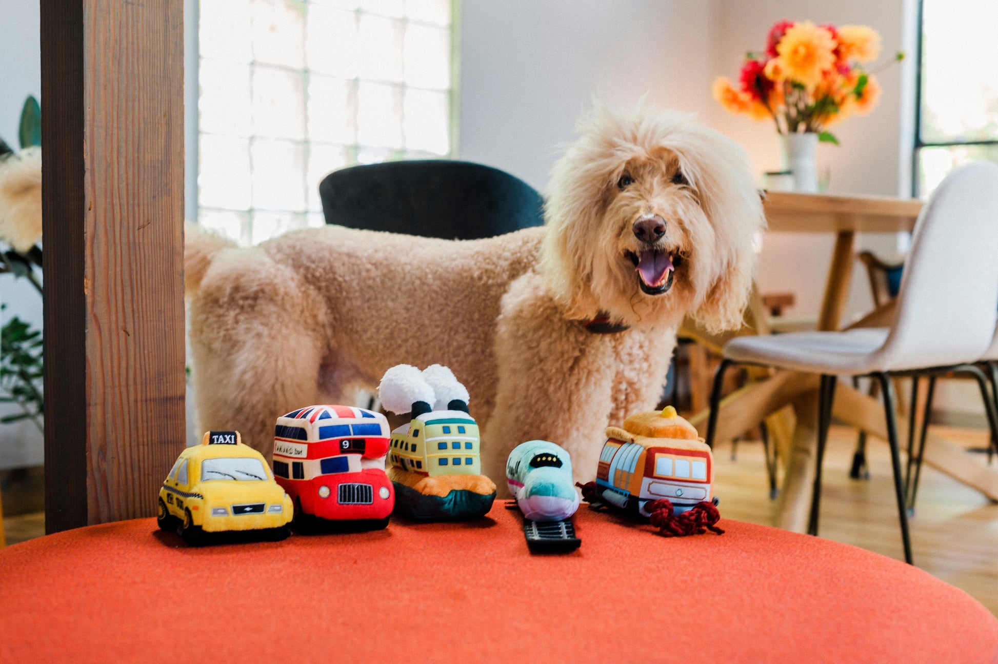 - Fetching Ferry: Sometimes it’s about the journey, not the destination. Your furry friend will love playing with this squeaky toy all day long and finding the crinkles hidden inside the plush steam clouds.