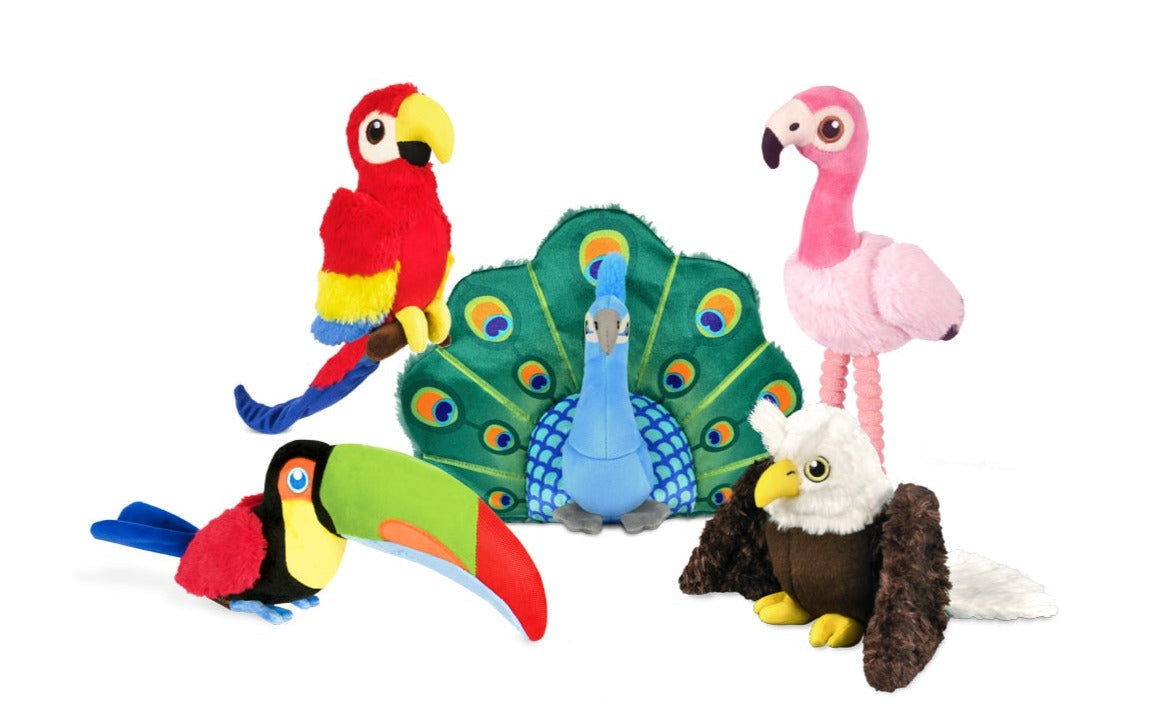 Get ready to watch your furry friend’s excitement soar when you surprise them with our Fetching Flock Plush Toy Collection! This fabulous flock of toys includes a Peacock, Eagle, Parrot, Flamingo and Toucan that are just waiting to get your pup’s tail (feathers) shaking with their alluring crinkles, numerous squeakers and satisfying crunches.