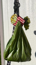 Tie a knot on your poop bag and push the knot completely through the center star-shaped area. Once it is securely through, clip your Poop Buddy onto your leash and enjoy your hands-free walk! Trademark pending.