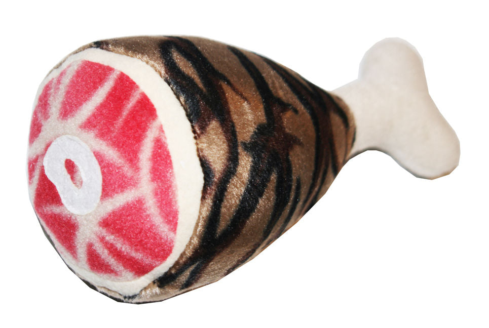 L : 8.75" plush fur toy with 1 bone and 2squeakers.