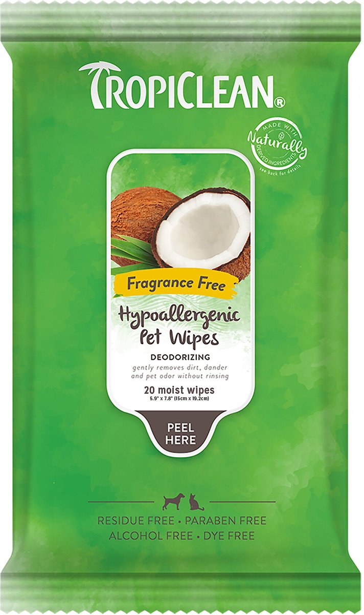 TropiClean Hypoallergenic Deodorizing Bath Wipes are mild enough for puppies, kittens and those with allergies. Our mild coconut cleanser gently lifts away dirt, drool, pollen and other potential unmentionables, leaving them fresh and ready to snuggle.