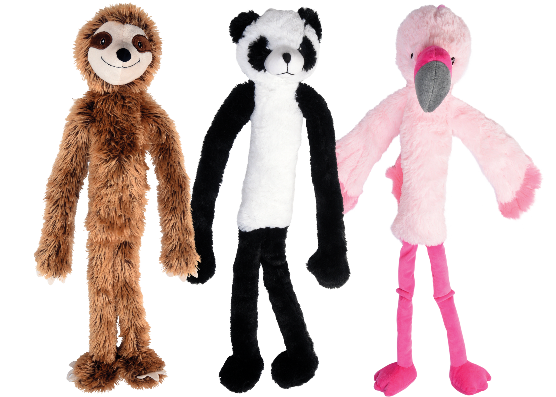 These super long plush playmates are perfect for a game of tug-o-war. The soft plush also makes them great for snuggling. Squeaks.