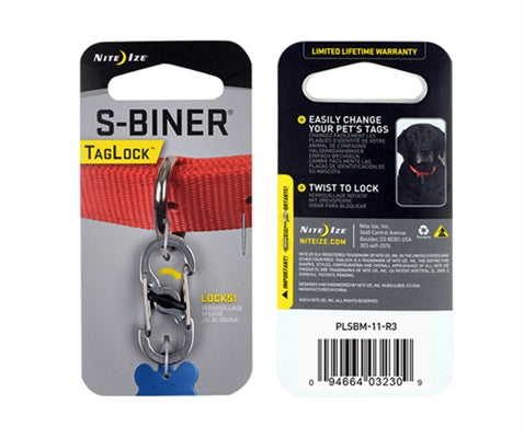 A brilliant alternative to split rings, the S-Biner TagLock is a durable stainless-steel double-gated carabiner featuring lockable gates. The TagLock allows you to quickly attach, detach, and secure your pet's ID tags to the D-ring of their collar or harness.