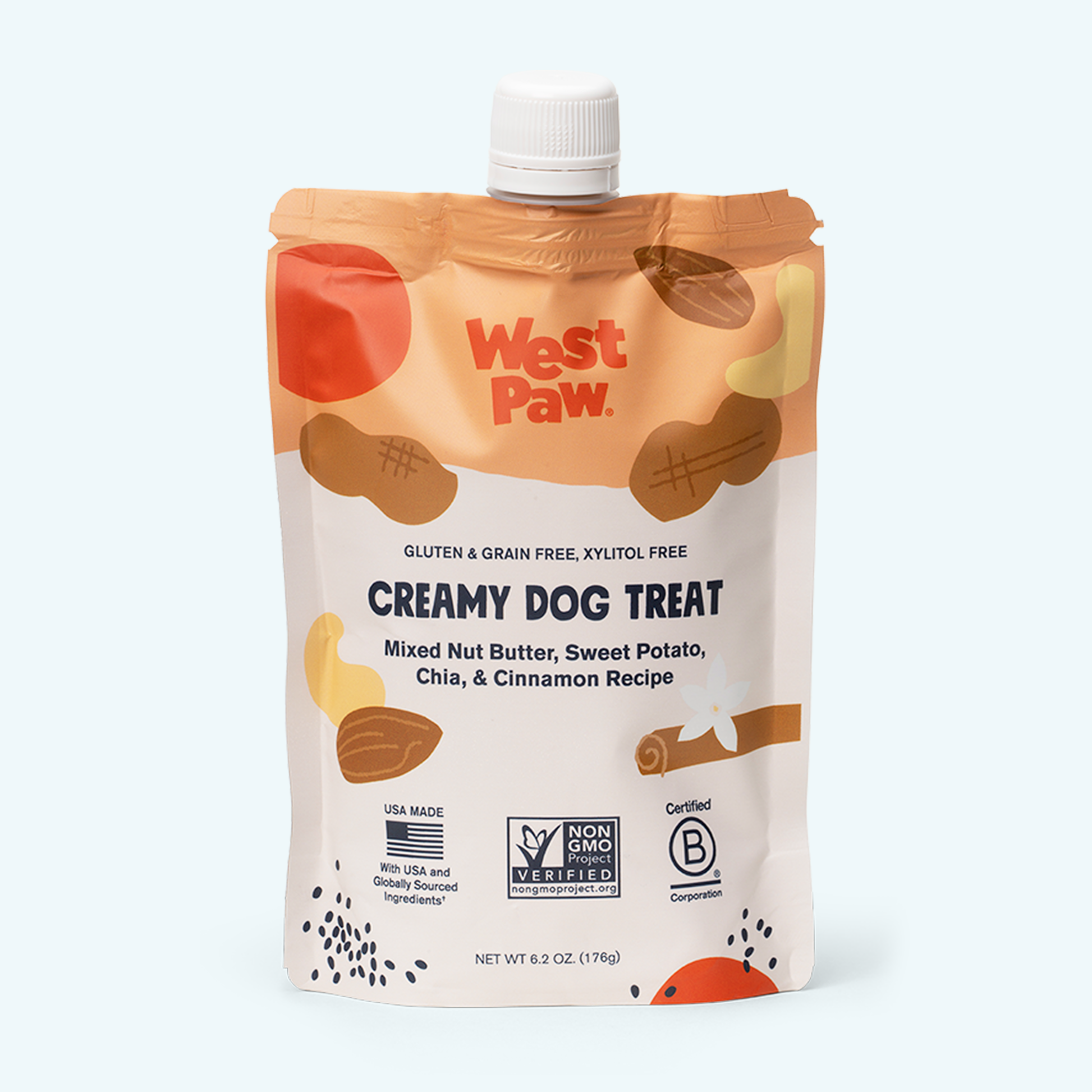 Humans love their nut butter, and so do dogs! West Paw mixed up creamy dog treats with fresh ground peanuts, almonds, cashews, sweet potato, and chia with a kiss of cinnamon - all in a mess-free dispenser. No sugar, no Xylitol, no preservatives, no artificial sweeteners, (or artificial anything) - just solid, simple nutrition for happy treating.
