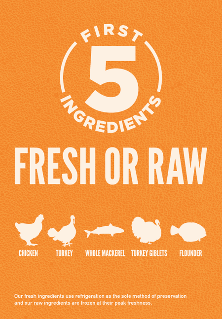 Chicken, turkey, whole mackerel, turkey giblets (liver, heart, gizzard), flounder, chicken liver, whole herring, eggs, dehydrated chicken, dehydrated turkey, dehydrated mackerel, dehydrated chicken liver, dehydrated egg, chicken fat, whole red lentils, whole pinto beans, whole peas, whole green lentils, whole chickpeas, natural chicken flavor, whole navy beans, pollock oil, lentil fiber, pea starch, chicken heart, choline chloride, dried kelp, mixed tocopherols (preservative), vitamin E supplement, zinc proteinate, whole cranberries, whole pumpkin, whole butternut squash, collard greens, whole apples, whole pears, copper proteinate, thiamine mononitrate, niacin, pyridoxine hydrochloride, dried chicory root, turmeric, sarsaparilla root, althea root, rosehips, juniper berries, citric acid (preservative), rosemary extract, dried Lactobacillus acidophilus fermentation product, dried Bifidobacterium animalis fermentation product, dried Lactobacillus casei fermentation product.