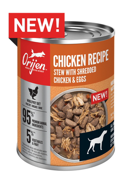 ORIJEN® Chicken Recipe Stew is a nourishing wet food with rich inclusions of savory chicken shreds that will help your dog thrive. Packed with 95%* premium animal ingredients, ORIJEN Chicken Recipe Stew includes fresh or raw chicken ingredients. This includes succulent WholePrey ingredients like organs and bone to add a source of essential vitamins, minerals and amino acids. Feed your dog ORIJEN Premium Wet Dog Food alone to add moisture and nourishment to their diet, or add it on top of their favorite ORIJEN kibble for a nutritious addition at mealtime.