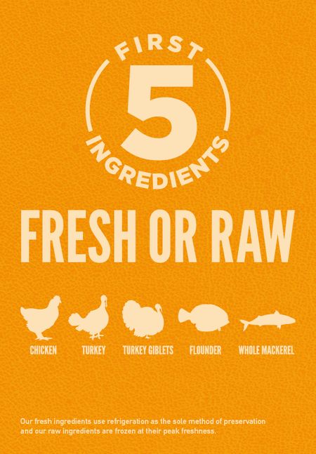 - First 5 ingredients always fresh or raw protein including poultry and fish