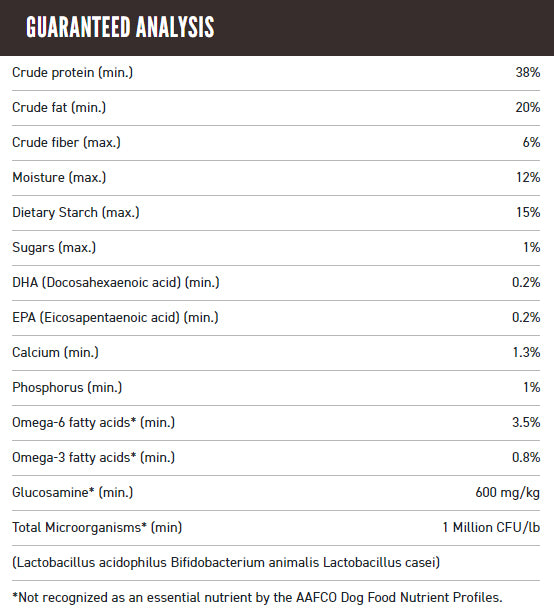 Metabolizable energy is 3960 kcal/kg (475 kcal per 8oz. cup) with 39% from protein, 16% from carbohydrates, and 45% from fat.