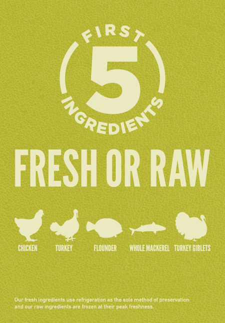 - First 5 ingredients always fresh or raw** protein including poultry, fish and organs