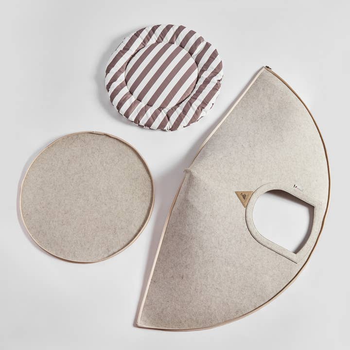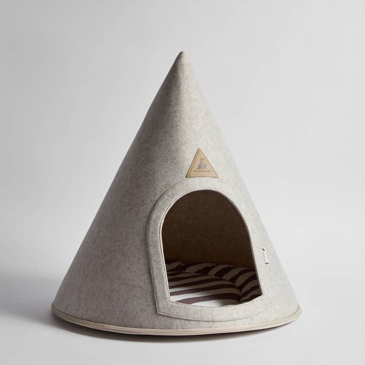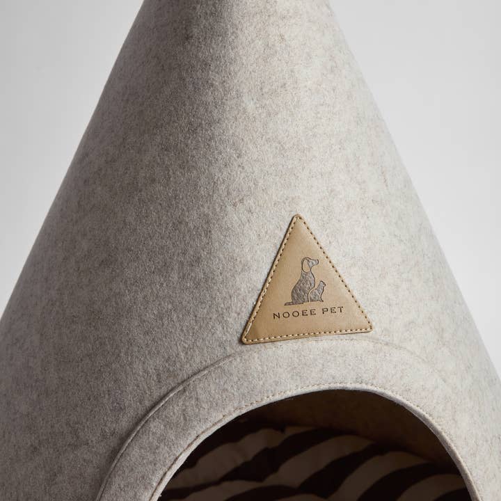 An iconic Nooee Pet classic is now available in an additional color, cream. Shaped in a cone with an arch opening, it includes an extra comfortable cushion that is removable. Zipper construction enables easy assembly and access throughout for cleaning including the interior. This home can be rolled up and placed into a convenient bag allowing you to carry a familiar spot for your pet when traveling. One side of the cushion is a light gray and the other side is a dark gray.