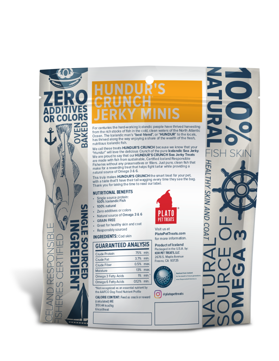 Hundur’s Crunch Jerky Minis have only one ingredient: Cod Fish Skin. The cod are caught in the North Atlantic Ocean in a certified sustainable manner and then air-dried so as to retain the inherent nutrients in the fish while also naturally preserving them (but your dog will just think that they smell and taste amazing). These formed fish skin treats offer a natural source of Omega 3 & 6 fatty acids, support skin and coat health, and help fight tartar while your smaller dog enjoys a treat made just for them. They make great replacements for rawhides and bones. And since they are only one ingredient, you can be sure that these treats are grain free and contain no artificial flavors, corn, wheat, or soy. Hundur’s Crunch also comes in the larger format Jerky Fingers.