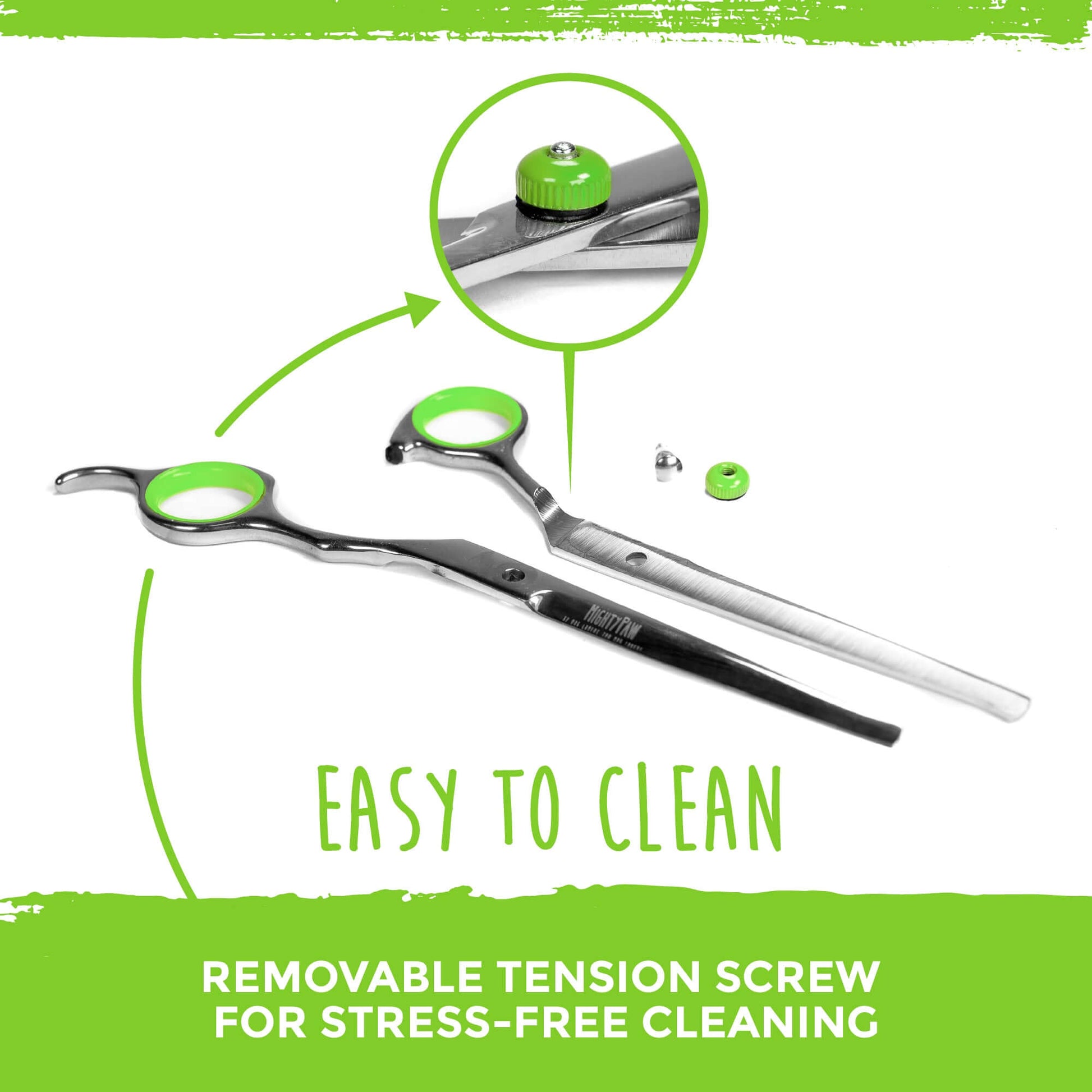 The Mighty Paw Pet Grooming Shears are made of titanium-coated, 100% stainless-steel blades that are extra sharp for quick and easy haircuts. Their rounded safety tips prevent accidental pokes. Once you’re done cutting, the blades are easy to clean and won’t rust or discolor. We recommend drying before storing them. The blades are fitted with a removable tension screw in order to separate them for a stress-free cleaning experience.