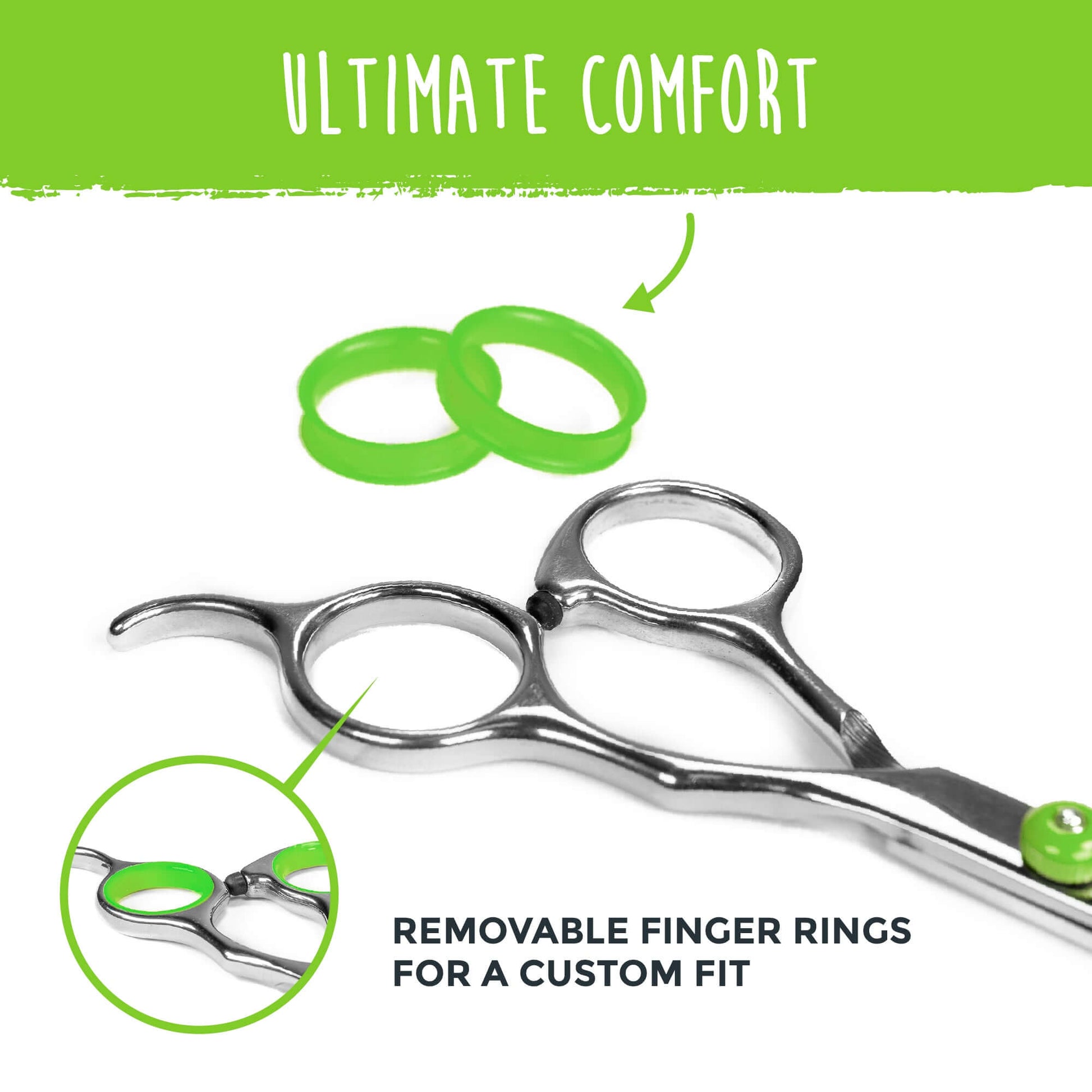 We designed our grooming shears with anti-slip handles and a pinch-preventing bumper between the two handles. They also have an ergonomic finger rest for more control and to prevent fatigue and cramps during long grooming sessions. Additionally, they feature removable finger ring inserts to properly fit your hand to the shears.