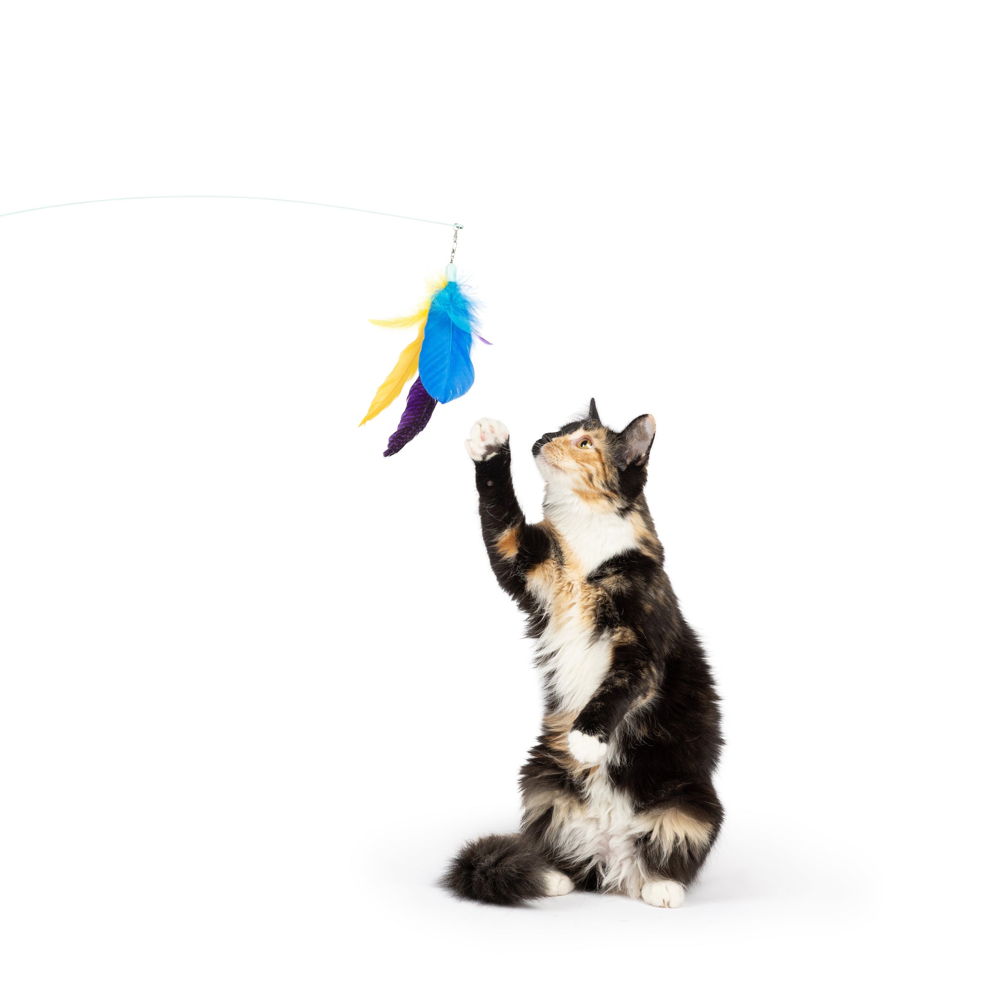 After playtime, store wands and teasers out of reach to prevent kitty from chewing on wires, streams, and small metal parts.