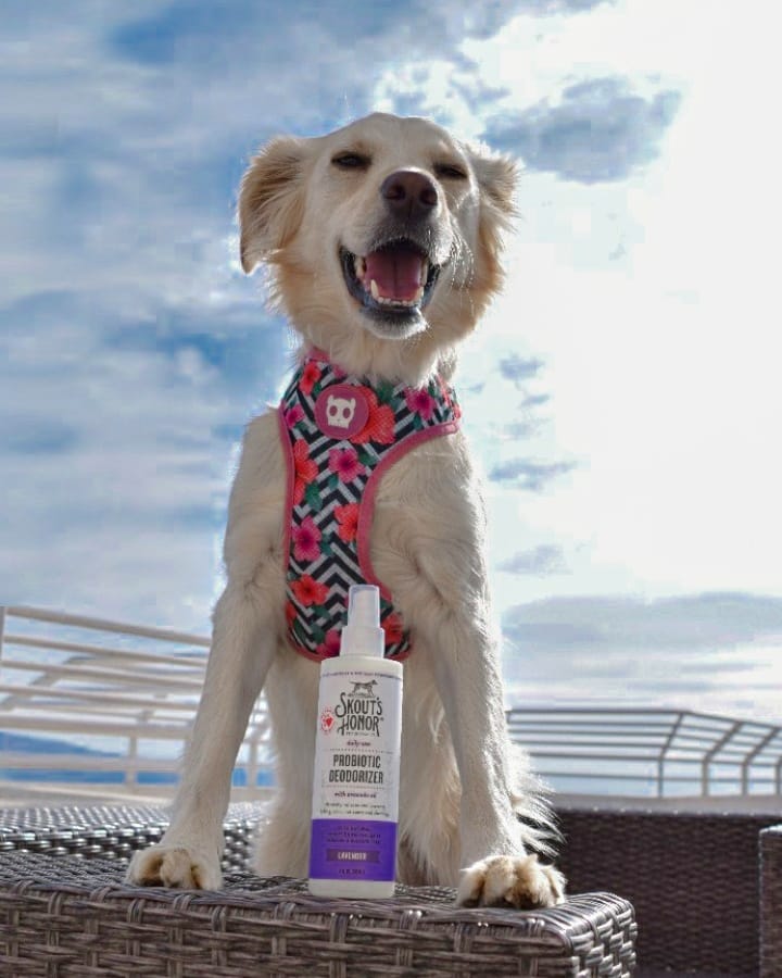 Our cat and dog deodorizing spray hydrates and deodorizes the skin and coat for a fresher, better-smelling pet in between washes. It contains avocado oil and topical probiotics that help support a healthy microbiome to defend against common skin problems such as itching, odor, dryness, dandruff, hot spots, yeast and excessive shedding.