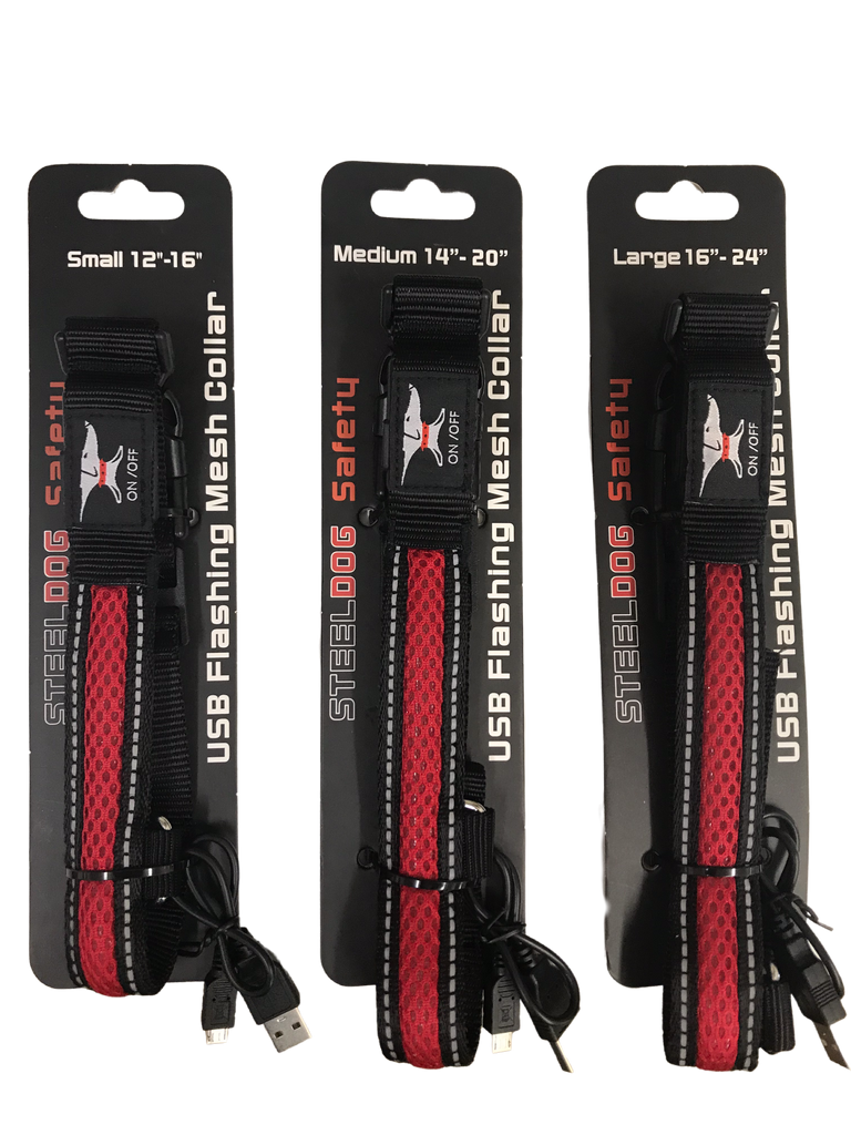 Providing optimal visibility, this rechargeable USB Flash Mesh Dog Collar is a great accessory to any pet that likes to adventure at night or the early morning. The collar light adjusts between three speeds: continuous, Slow Blink, Fast Blink. When the light is used, the battery can last up to 5 hrs after one hour of charging.