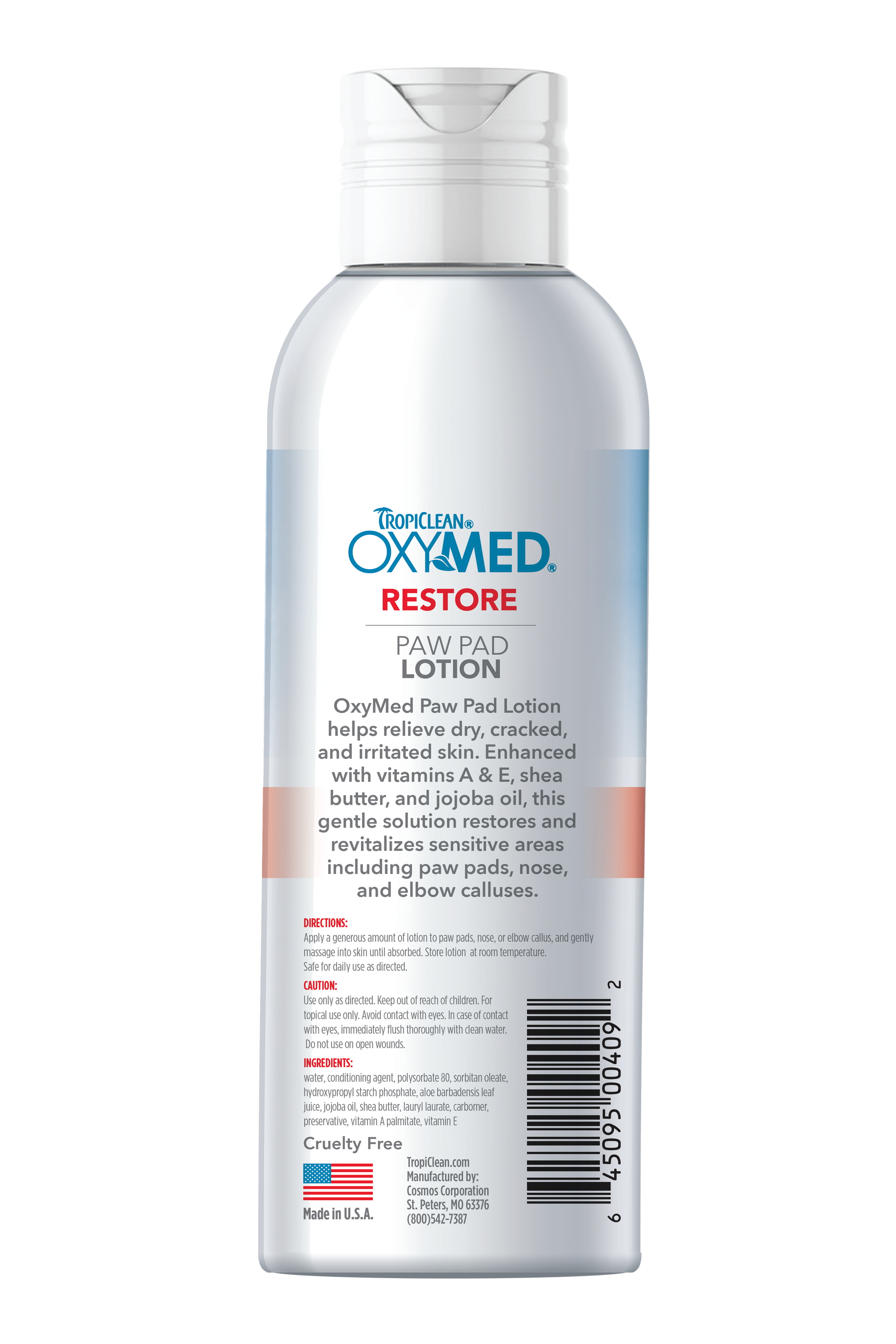 OxyMed Paw Pad Lotion helps relieve dry, cracked, and irritated skin. Enhanced with vitamin A & E, shea butter, and jojoba oil, this gentle solution restores and revitalizes sensitive areas including paw pads, nose, and elbow calluses.