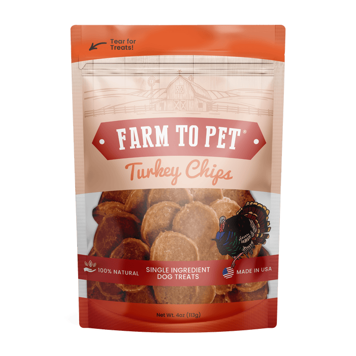 Farm to Pet Turkey Chips pet treats are as healthy and nutritious as they are crunchy and delicious! These single-ingredient treats for dogs - and also cats! - are made of pure, all-natural turkey breast with zero additives, preservatives or artifcial ingredients. Plus, this novel protein for pets is easy on the stomach and ideal for dogs with chicken allergies! High in nutrition, low in fat and easily digestible, our US-made chips also make great training treats for dogs of all ages.