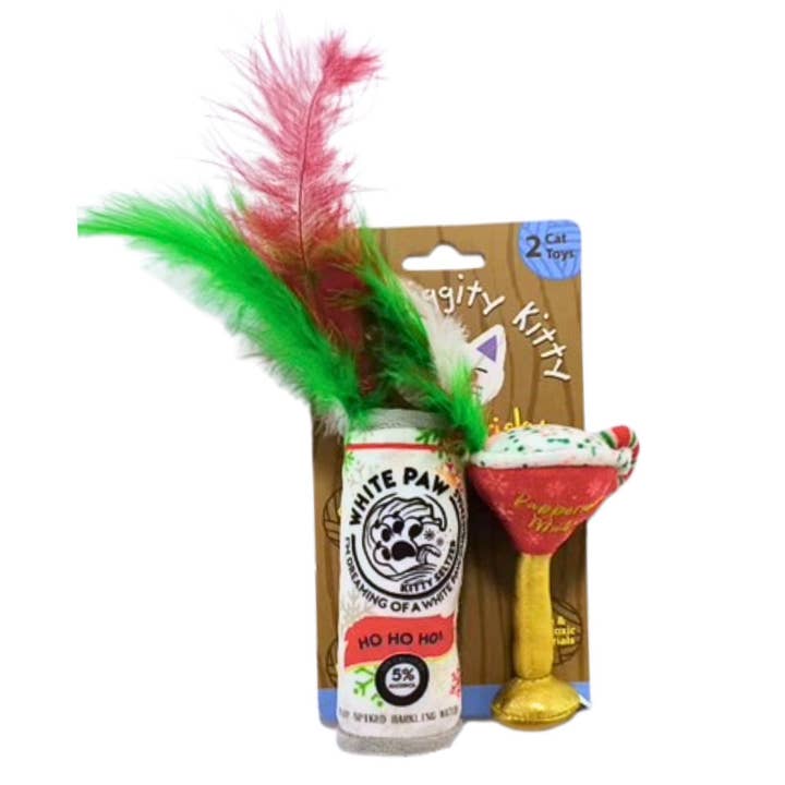 Toast to festive feline fun with our White Paw Kitty Seltzer & Pawpermint Cattini Holiday Set! This delightful duo of crinkling toys combines the refreshing fizz of White Paw Kitty Seltzer and the minty charm of Pawpermint Cattini. Infused with organic catnip, these plush toys offer your cat a bubbly blend of playful textures and tantalizing scents, making playtime a sparkling sensation this holiday season.