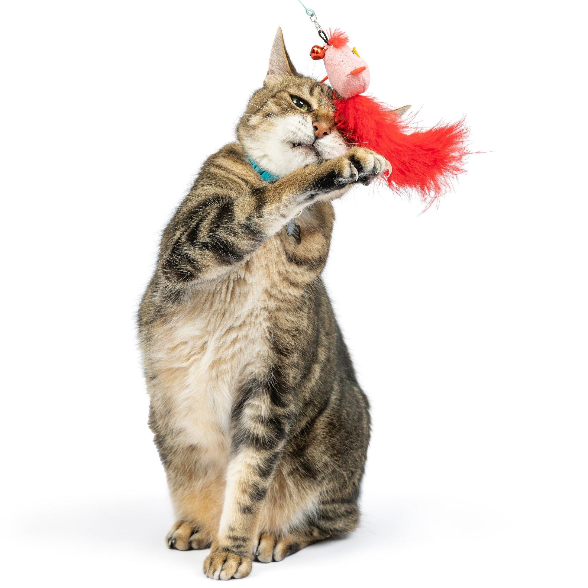 After playtime, store wands and teasers out of reach to prevent kitty from chewing on wires, streams, and small metal parts.