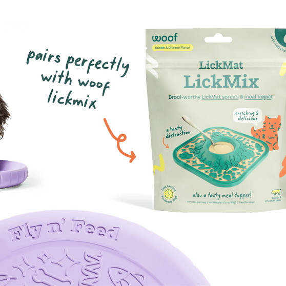 Fly n’ Feed is the flying disc with a secret superpower—it flips into a calming lick mat. Lightweight yet durable, toss for high-energy fetch, then flip to reveal dual-texture lick zones that help pups unwind after play. Rolls up for travel, pops flat for storage, and even doubles as a water dish. Made from tooth-friendly, scuff-resistant rubber and dishwasher safe. Pairs perfectly with Woof LickMix or your pup’s favorite spread.