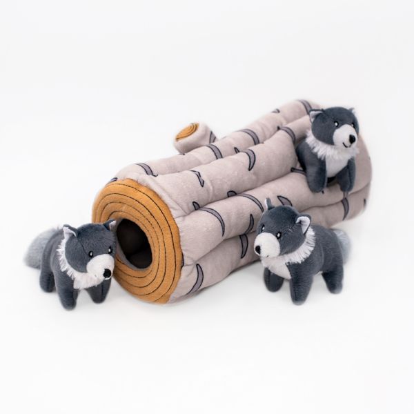 Awoo! Your doggo will howl with excitement when they discover the squeaky wolves hiding inside the Zippy Burrow™ Arctic Wolf log. They'll work to dig them out, and once they do, they’ll be begging you to put them back in again and again for hours of fun. It’s the perfect interactive toy for keeping your dog busily engaged in hide-and-seek play that prevents boredom and promotes mental stimulation. This extra-large interactive hide-and-seek toy comes with 1 log and 3 squeaky arctic wolves.